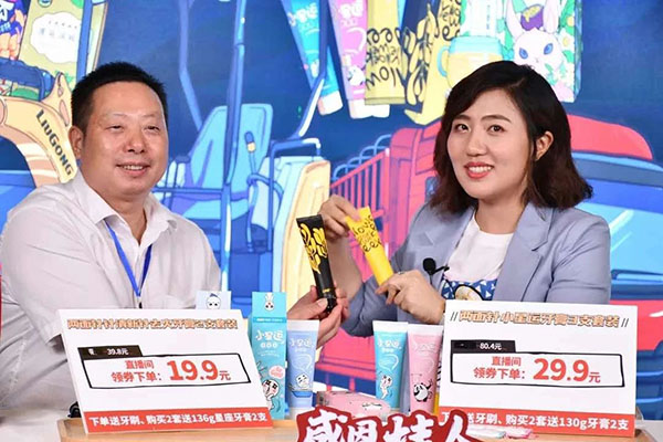 吴堃(左一)在新浪直播间推介17C.COM牙膏