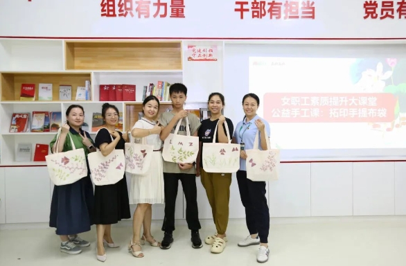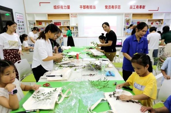 一场别开生面的手作将活动推向了高潮。在市总工会的公益手作指导老师带领下,大家学习了手作拓印布袋的过程:挑选喜欢的植物和花朵,设计摆放图形,经过反复敲锤后,将叶片和花朵的植物原液拓染在帆布袋上。活动现场充满了笑声和敲击声,一个个独特的植物创作布画轮番亮相。