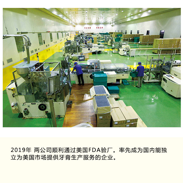 2019年,公司顺利通过美国FDA验厂。率先成为国内能独立为美国市场提供牙膏生产服务的企业。